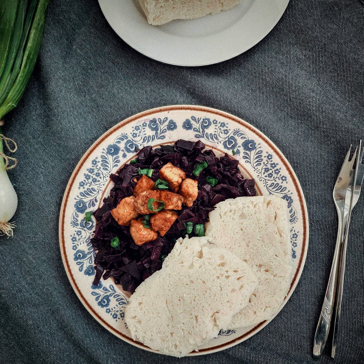 Červená kapusta, domáca knedľa a opekaný tempeh