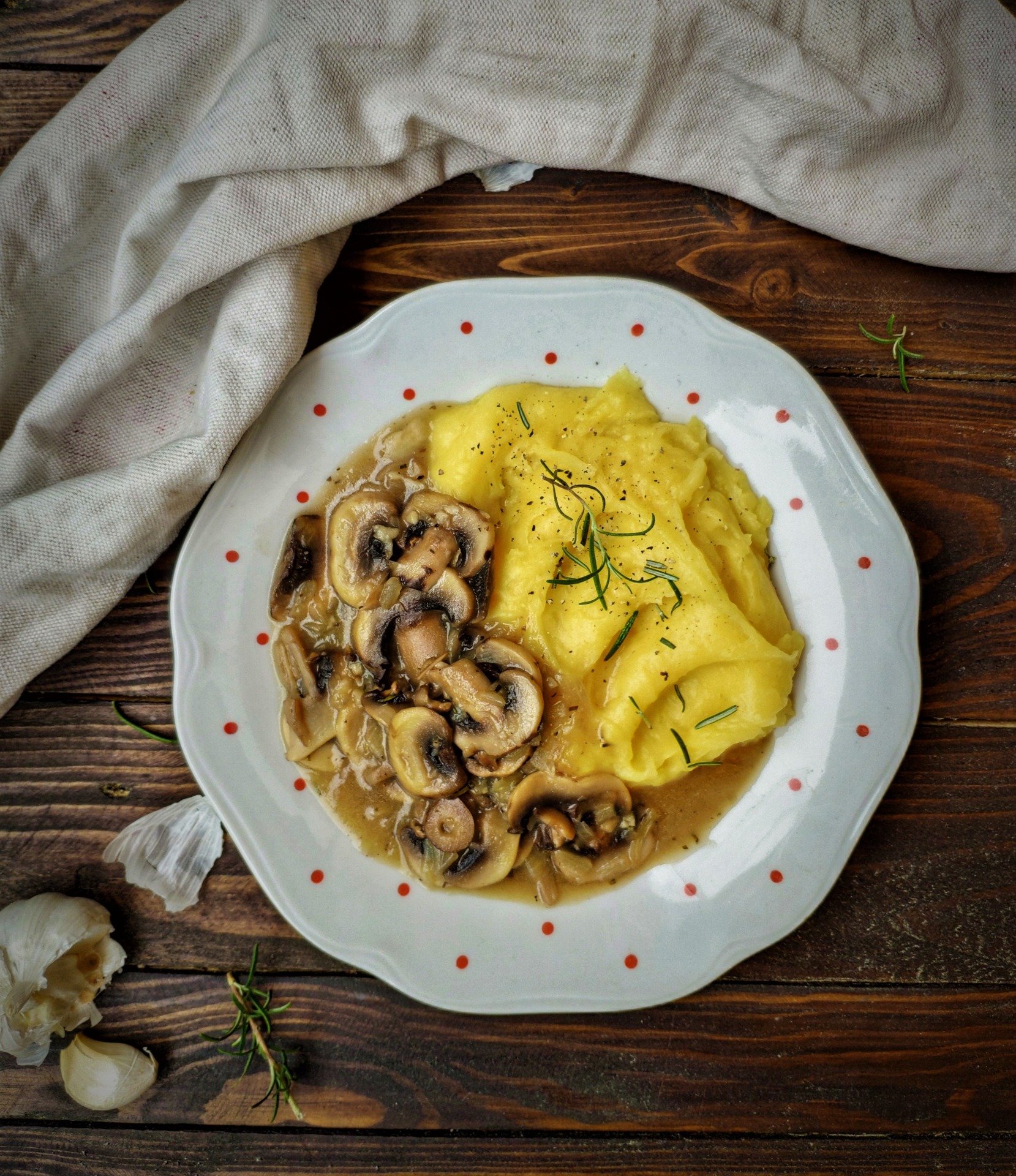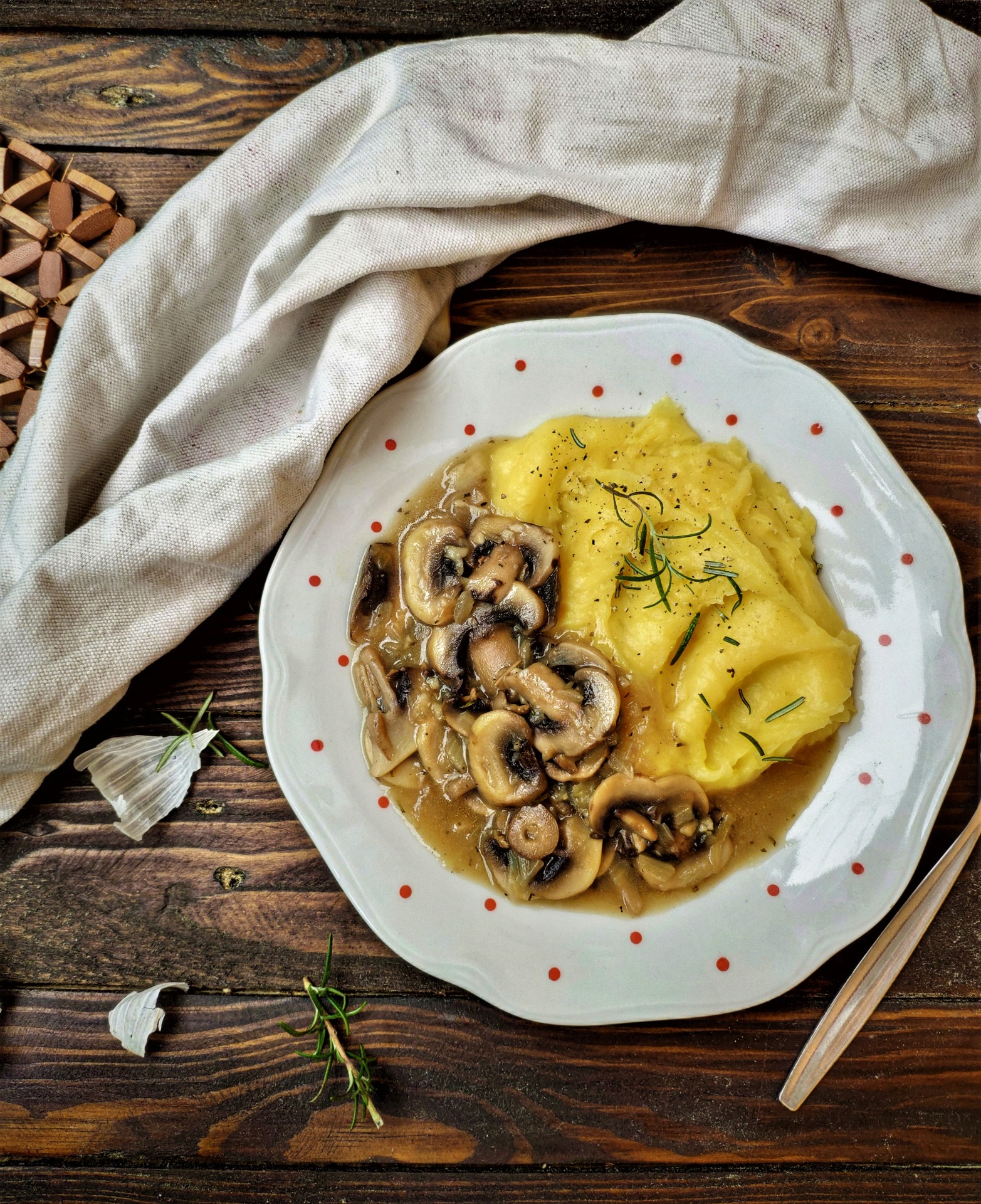 Dokončíme si zemiakovú kašu. K zemiakom pridáme sójové mlieko a maslo a všetko vymixujeme ponorným mixérom do hladka. Samozrejme nezabudnime pridať soľ podľa chuti. Je dôležité, aby ste zemiaky a ostatné ingrediencie mixovali za horúca.