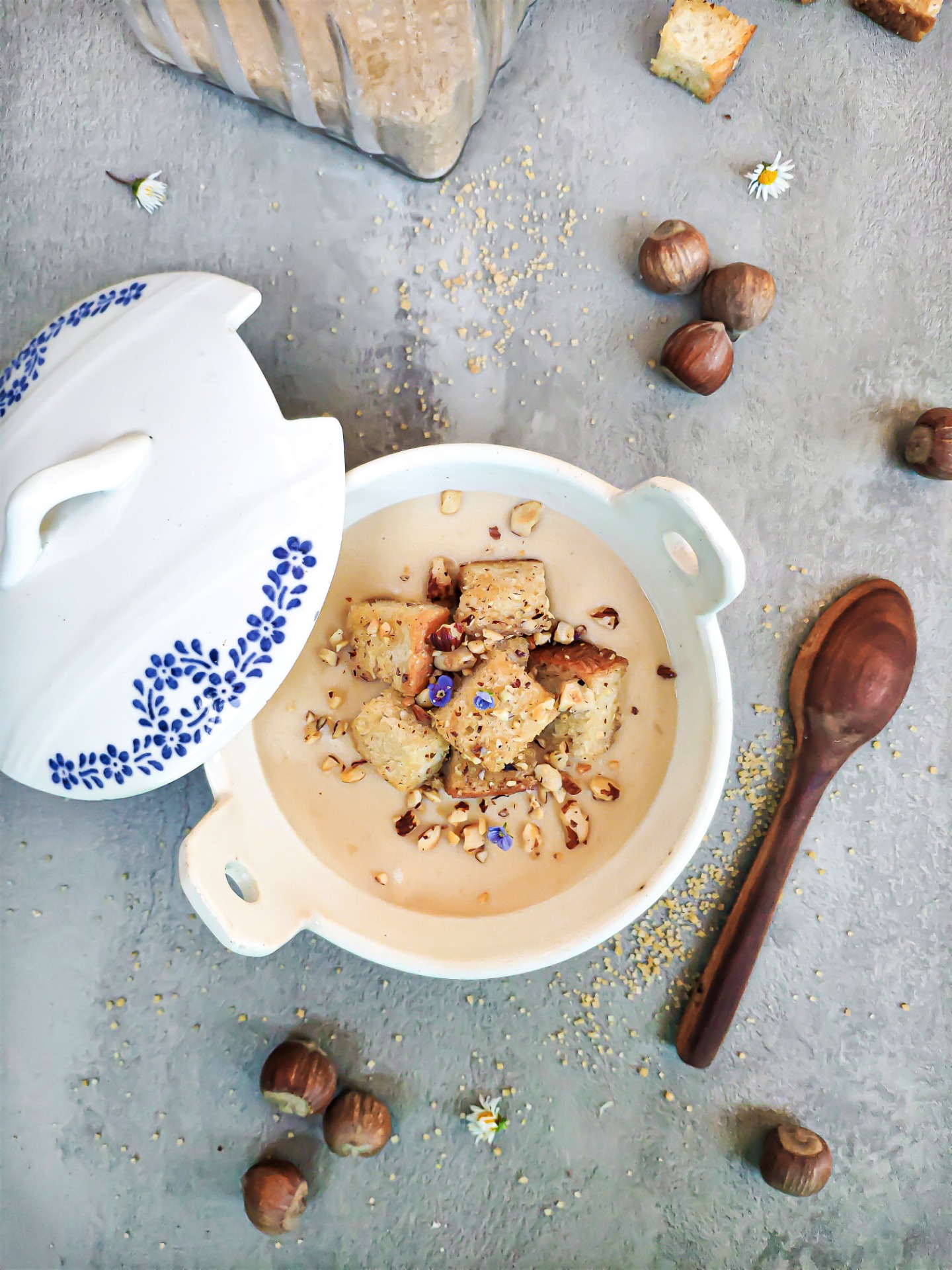 Chlieb si nakrájame na malé kocky a opražíme ho na panvici spolu s maslom a orieškami.